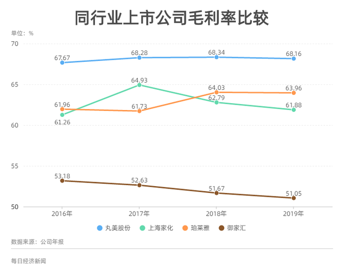 《每日经济新闻》记者查询发现,2016年~2019年,丸美股份综合毛利率稳定在68%左右,相较于行业里国内其他品牌,具有较强竞争力。