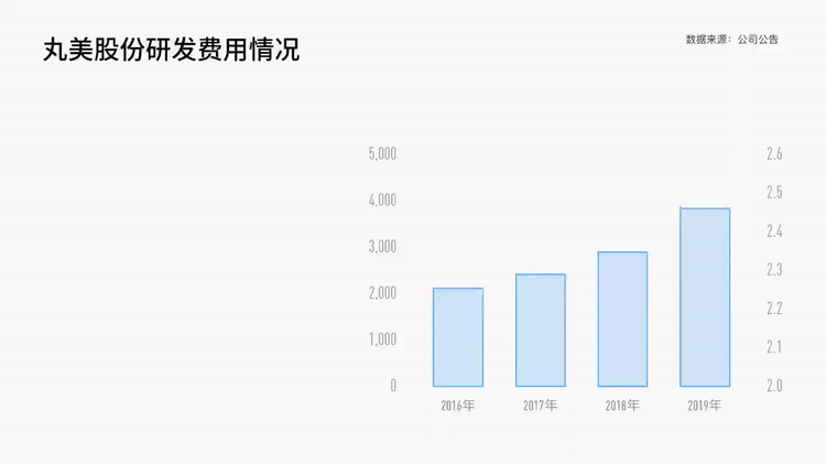 2016年~2019年,丸美股份用于广告宣传类的费用支出占当年营收比例约为21%,研发费用占比则超过2%。同行业上市公司中,珀莱雅、上海家化同期广告费用占营收比重约为20%和30%,研发费用占比也均达到2%。