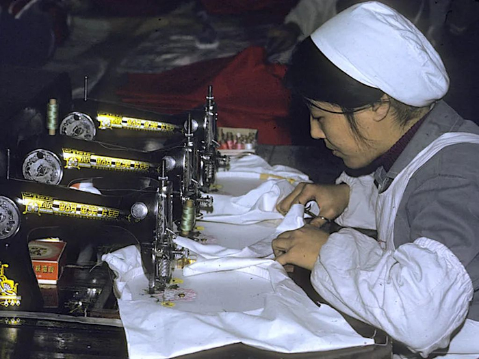 1972年,正在用“蝴蝶牌”缝纫机绣花的女工