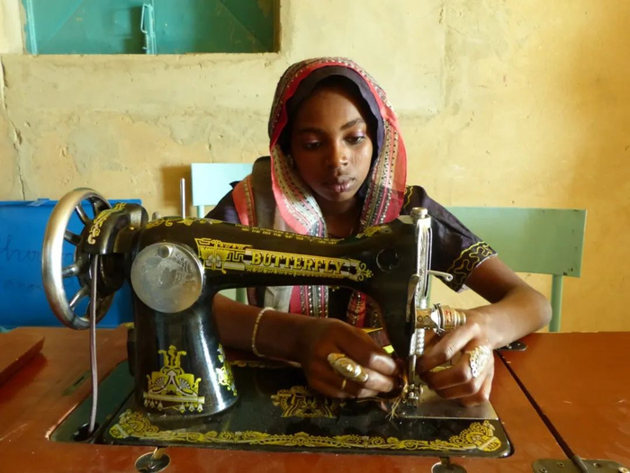 2018年,一位正在使用“蝴蝶牌”缝纫机的尼日尔女工