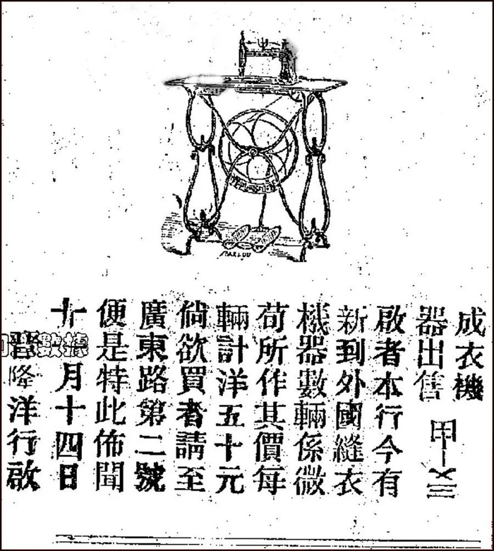 1872年12月14日的《申报》上首次刊出“微荀”成衣机广告