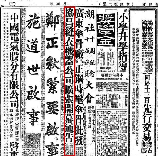 1934年6月14日《申报》刊登的协昌缝衣机器公司扩张开幕通告