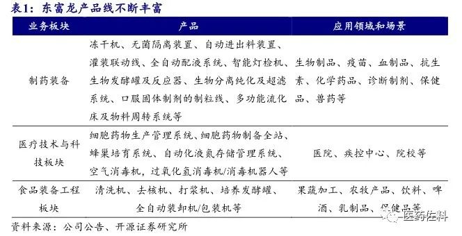 近年来公司产品线不断丰富。在制药设备领域,从以单一冻干机为主逐步升级为提供从单机到冻干系统等制药系统设备,近年来新增生物发酵罐及反应器、口服固体制剂生产设备等多个新产品,同时也提供注射剂、固体制剂、生物工程等整体解决方案,公司产品的应用领域和场景持续拓展。除了传统制药装备以外,公司通过投资设立东富龙医疗科技、收购上海承欢等方式相继新增医疗技术与科技和食品装备工程两项新业务板块,未来有望成为公司新的业绩增长点。