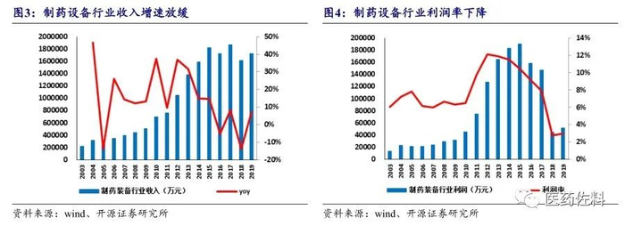 制药设备行业在 2015 年以前保持快速增长态势,主要是由于:1)医药制造业处于高速成长期,行业投资旺盛,2015 年以前全行业固定资产投资完成额同比增速基本保持在 10%以上,有大量新增生产线和设备需求;2)国家食品药品监督管理局于 2011 年 3 月起开始实施新版 GMP 认证标准,并要求药品生产企业中血液制品、疫苗、注射剂等无菌药品的生产,应在 2013年 12月31 日前达到新版 GMP 的要求,其他类别药品的生产均应在 2015 年 12 月 31 日前达到新版 GMP 的要求。与1998 年版旧标准相比,新版 GMP 认证标准对药品企业无菌生产要求更加严格,制药设备需求在短期内出现爆发式的增长。2015 年后由于医药制造业增速下滑,行业固定资产投资增速放缓,同时由于行业新版 GMP 认证高峰结束,制药设备需求持续回落,2015 年至 2018 年我国制药设备行业增速明显放缓,利润率也由 2015 年的10%以上下滑至 2018 年 2.74%的历史最低值。