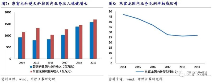 2019 年我国制药设备行业实现收入 172.7 亿元(+7.07%),利润 5.19 亿元,利润率为 3.01%,与 2018 年相比略有提升,行业拐点初现。2015 年至 2019 年制药设备行业龙头公司东富龙和楚天科技国内业务收入仍处于增长态势,其中东富龙复合增速为 6%,楚天科技复合增速为 18%(有并购并表因素),而同期行业收入下滑约5%,表明在行业调整期中龙头市占率出现了提升,2019 年东富龙的市占率已达到13%。随着竞争格局的优化和市场集中度提升,我们预计未来龙头制药设备行业企业的盈利能力将逐步增强,2019 年东富龙国内业务已经毛利率已经出现小幅提升。长期来看,由于我国医药行业需求潜力大,新版《药品注册管理办法》取消了 GMP 认证,改为强化对药品生产全过程和药品全生命周期的动态监管,预计未来制药设备需求将平稳释放,行业有望从短期爆发式增长转化为长期稳健增长。