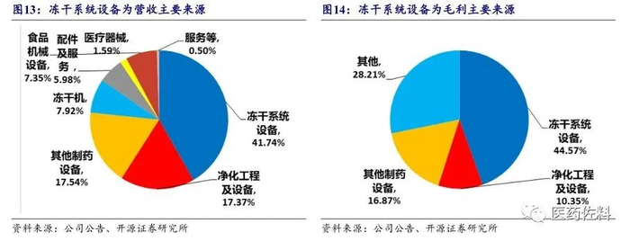 公司是国内冻干系统设备龙头企业,2019 年冻干系统设备收入和毛利占公司整体收入和毛利的比例分别为 41.74%和 44.57%,是公司业绩的主要来源。此外近年来净化工程及设备和食品机械设备也保持较快增长态势,成为公司业绩新的增长点。