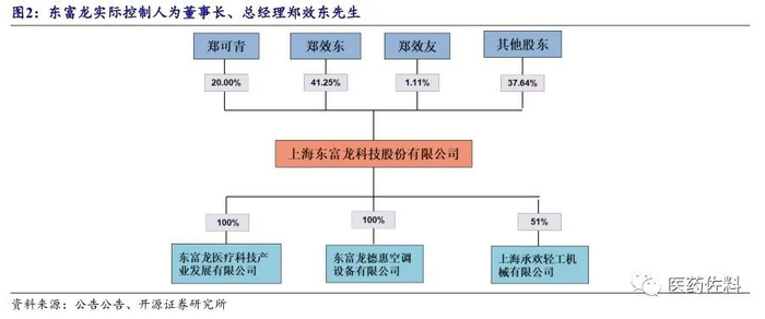 公司实际控制人为董事长兼总经理郑效东先生,持有公司 41.25%股权;郑效东先生女儿郑可青女士持有公司 20%股权,为郑效东先生的一致行动人。副总经理郑效友持有公司 1.11%股权。公司旗下拥有多个子公司,其中主要子公司包括:1)东富龙医疗科技产业发展有限公司,主要从事医疗科技领域内的技术开发,医疗器械的研发销售等,提供细胞治疗整体解决方案,在消毒领域为医院等提供整体解决方案;2)上海承欢,主要从事食品机械设备研发和销售;3)德惠设备,主要从事洁净工厂技术研究、工程配套安装施工。