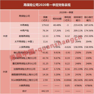 从具体公司来看,2020年一季度,中再寿险和中再产险在12家再保险公司总保费中分别占比40.48%和17.26%,中再系再保公司作为开业最早的中资再保公司,得益于政策支持曾垄断国内再保险行业。紧随其后的分别是瑞再北分、慕再北分、汉诺威再上分、法再北分、德国通用再上分等五家外资再保险公司。