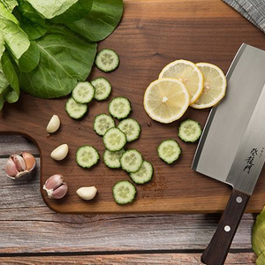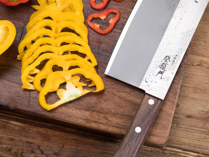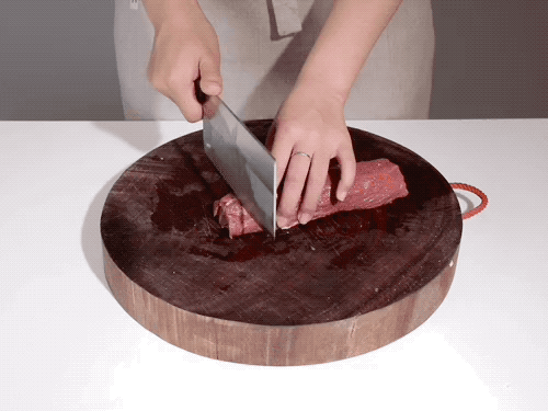 01 适合中国人使用习惯的刀超轻超安全 中国人做菜爱用方刀,好拿好用劲;无论切片、切丝,刀都“不飘不歪”; 切好的菜,顺手一抄,就运送到锅里了,超方便。 但是方刀有个普遍的问题,重!劲小的女生,每次切完菜都有一种手要折了的感觉。 这把藤次郎菜刀,非常轻,重量只有305g,切一桌子菜都不累手。