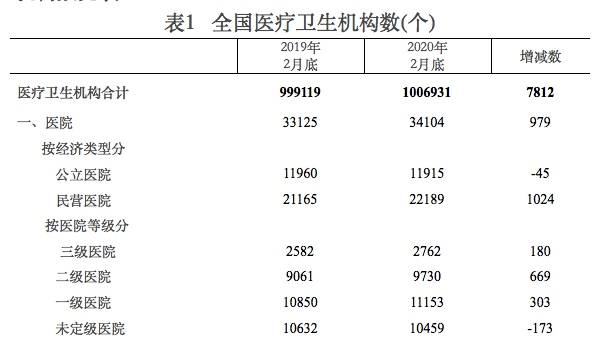 官方数据显示,截至2010年11月底,国内共有公立医院13904家、民营医院6644家。国家卫健委最新统计数据显示,截至2020年2月底,全国共有医院3.4万家,其中公立医院1.2万家、民营医院2.2万家。与2019年2月底比较,公立医院减少45家,民营医院增加1024家。