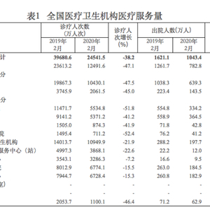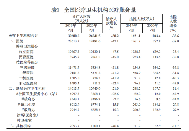 2020年2月全国医疗卫生机构医疗服务量。来源:国家卫健委官网