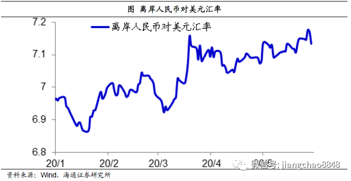 但是从2019年开始,美国再度进入降息周期,在2020年甚至重启了零利率。而期间中国虽然也跟随美国降息,但降息时间晚于美国,而降息幅度也远不及美国。在2019年中美利差从0扩大至0.77%,而2020年以来又进一步扩大至5月底的1.43%,但是2019年与2020年的人民币对美元汇率分别贬至6.97和7.13。