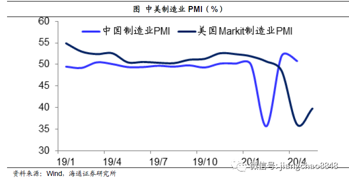 从经济的恢复来看,我国3月份制造业PMI指数就回到了50%的荣枯平衡线以上,4月份的工业增加值增速已经由负转正至3.9%,我们预计2季度中国经济增速将由负转正至3%。而美国4、5两月的制造业PMI指数都在40%以下,纽约联储预计美国2季度经济环比将大幅下降35.5%。