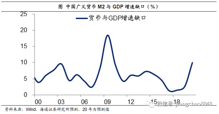由于货币增速大幅上升,而经济增长的恢复较弱,预计货币增速与经济增长之间的缺口将高达10%以上,比去年的2.6%大幅上升。而在过去的20年中,这一缺口仅次于2009年。