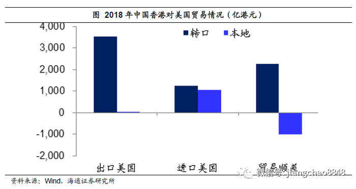 实际上,虽然我们有大量商贸通过中国香港转口,但转口商贸的进出口本身都是按照“原产地原则”进行征税,因而如果美国取消中国香港的特殊税区地位,受影响的只是中国香港本地对美国的进出口。但根据中国香港工贸署的统计,2018年中国香港本地对美国出口36.42亿港元,而从美国进口1053.46亿港元,中国香港本地对美商贸逆差1017亿港元。这意味着受影响更大的是美国自身,会减少其对中国香港的商贸顺差。