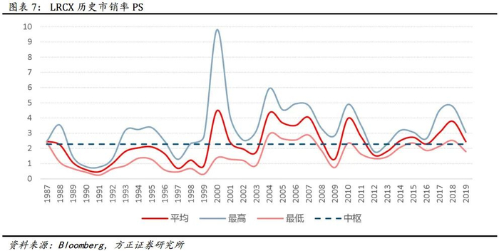 从应用材料 1987-2019 年的 PS 估值来看, 2000 年与 2004 年的峰值分别达 15.2X 与 9.6X, 2007 年后随着业务成熟, 估值逐步趋于平稳,2017 年后的估值中枢约 2.7X, 2017 年峰值曾达 5.8X。整体来看,1987-2019 年公司 PS 估值中枢为 3.04X。