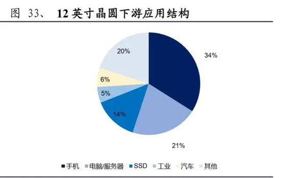 大尺寸晶圆是发展趋势,12 英寸硅片成为主流。因在晶圆上制造方形或长方形的 芯片导致在晶圆的边缘处剩余一些不可使用的区域,更大尺寸的晶圆利用率越高;晶圆尺寸越大,同一晶圆能生产的芯片数量也将越多,生产的效率也将提高。2008 年开始,12 英寸硅片逐步替代 8 英寸硅片成为主流。较 8 英寸硅片,12 英寸硅片 下游用于手机、电脑、SSD 等领域的占比更高。