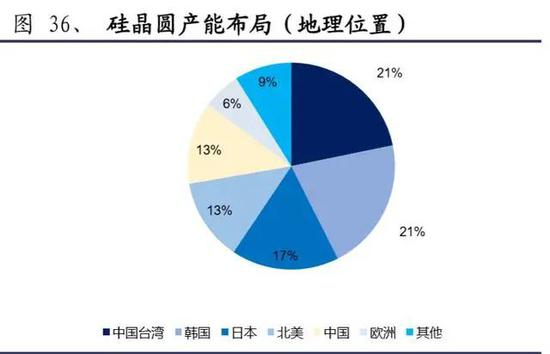 全球硅晶圆产业呈现寡头垄断的格局,市场集中度极高。日本信越(Shin-Etsu)、 日本胜高(Sumco)、台湾环球晶圆(Global Wafers)、德国 Siltronic、韩国 LG Siltron 五大巨头占据全球 95%的市场份额。硅晶圆产能目前也主要分布在中国台湾、韩 国、日本、北美等行业巨头所在国家或地区。目前中国大陆硅晶圆产能占全球约 13%,但主要为海外企业来中国投资所建,本土企业和海外巨头差距非常巨大。