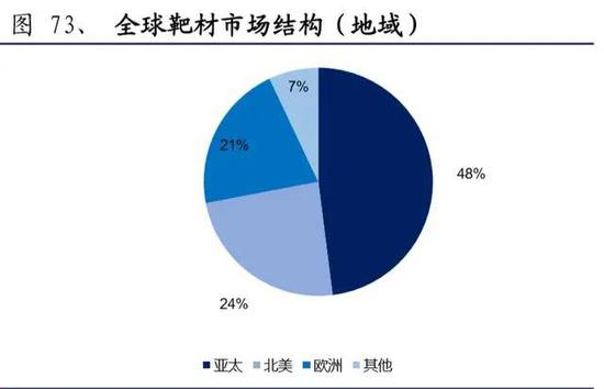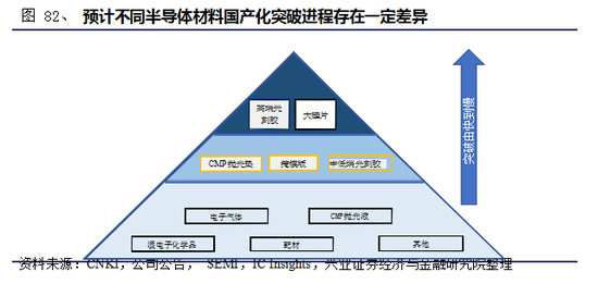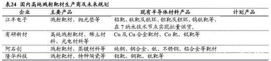 (5) 靶材:对外依存度仍然高于 90%,江丰电子等个别企业突破了 7nm 技术节点,进入国际靶材技术领先行列,成为中芯国际、台积电、格罗方德、意法半导体等厂商的高纯溅射靶材供应商。
