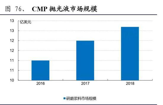2016-2018 年全球 CMP 抛光材料市场规模分别为 17.5 亿美元、 19.0 亿美元和 20.1 亿美元,预计 2017-2020 年全球 CMP 抛光材料市场规模年复合增长率为 6%。其 中 CMP 抛光液 2016-2018 年销售额约为 11.0、12.0、12.7 亿美元,CMP 抛光垫 2016-2018 年销售额约为 6.5、7.0、7.4 亿美元。
