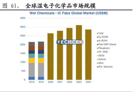 为了满足半导体集成电路的发展水平,湿电子化学品的技术实现了 G1 到 G4 级 不同等级的商业化生产,并向更高技术等级的产品进步。2019 年全球湿电子化学 品规模约 22 亿美元。据 Techcet 预计,全球湿电子化学品市场规模在 2024 年有 望达到 29 亿美元,2019-2024 年的年复合增速有望达 5.7%。