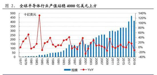 半导体行业短期逢波动,2019 年规模较 2018 年出现下滑,但仍然站稳 4000 亿美 元上方。伴随半导体技术的革新、下游应用的推广,半导体行业规模大幅扩张,对经济、国家安全等领域的影响力日益增强。根据 IMF 测算,每 1 美元半导体芯 片的产值可带动相关电子信息产业 10 美元产值,带来 100 美元的 GDP。2019 年 全球半导体行业收入约为 4130 亿美金,较 2015 年、2010 年分别增长 22%、 40%, 较 2018 年同比下滑。伴随智能汽车、智能电网、人工智能、物联网、5G 等领域 兴起,全球半导体市场规模将进一步扩大。