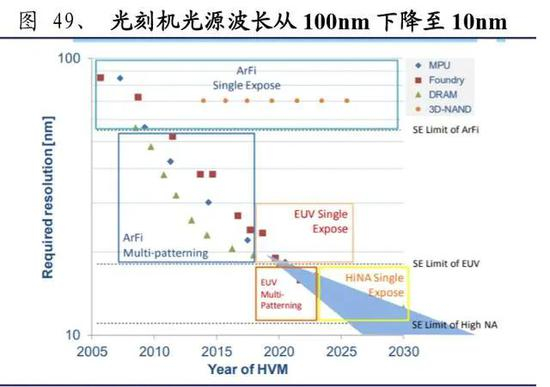 (1)技术更迭快:光刻光源波长的缩小,使得光刻机的分辨率不断提升。光刻 胶的功能参数要求和质量要求一直随着集成电路制造工艺的变化和发展而提高, 以适应发展的要求。IC 集成度历经微米级、亚微米级、深亚微米级,目前已进入 纳米级阶段,光刻胶根据所适配的刻蚀用光的波长不同而分为普通宽谱光刻胶、g 线(436nm)、 i 线(365nm)、 KrF(248nm)、 ArF(193nm)、 F2(157nm),以 及最先进的 EUV(<13.5nm)线水平,其相关技术壁垒随刻蚀用紫外光波长缩短而 相应提高。半导体行业目前主要使用光刻胶包括 g 线、i 线、KrF、ArF 四类