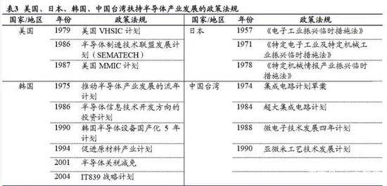 (2)日本:《电子工业振兴临时措施法》、《特定电子工业及特定机械工业振兴临 时措施法》、《特定机械情报产业振兴临时措施法》分别于 1957 年、1971 年、1978 年制定,三部法规极大的促进了日本企业积极发展本国的半导体产业。日本“超 大规模集成电路研究计划” (VLSI,1976~1980)总投资 737 亿日元,政府投入 291 亿日元。日本“超大型(400mm)硅技术研究开发计划” (1996~2001)经费 134 亿日元,政府投入 50.1%。