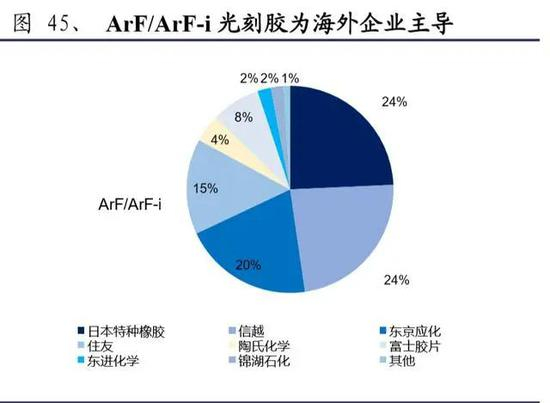 (3)日本企业占据高端半导体光刻胶主要市场。ArF-i 光刻胶在 DP 技术加持下 制程可达 14nm,也正是目前目前使用最为广泛的技术。从市场上看,国外企业仍 旧强势,垄断国内半导体市场绝大多数份额。尤其是以特种橡胶、信越、东京应 化等为首的日本企业占据高端光刻胶的主要市场。