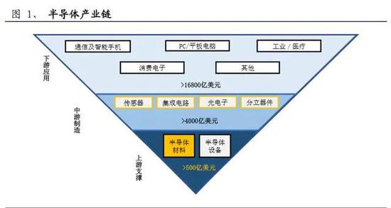 半导体作为现代电子产品的“大脑”,促进了通信、电脑、医疗、交通、新能源 等各行业的发展;半导体产业是支撑经济社会发展和保障国家安全的战略性、基 础性和先导性产业。半导体行业产业链上游包括半导体材料、半导体设备等,半 导体主要用于制造光电子器件、分立器件、集成电路、传感器等,下游应用主要 在通信、医疗、电脑等。截至 2019 年,半导体产业下游应用市场规模已超 16800 亿美元。