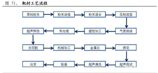 典型的溅射靶材工艺流程可以分为约 16 个步骤,其中包括 10 个技术要求较高主 要工序。首先,由于应用场合的特殊性,溅射靶材对原材料纯度、粒度、均匀度 等都有较高要求,需要专门采购或制备高纯金属粉末;其次,制造过程中针对不 同种类的原材料的烧结、晶化、机械加工过程,有大量的具体参数需要调试摸索;再者,加工环节对机械加工精度、焊接技术、高温高压操作、材料检验水平都有 较高要求。因此,溅射靶材的制造过程技术壁垒较高。