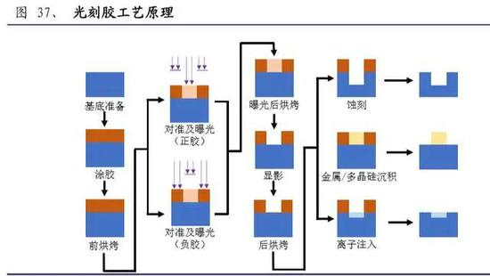 半导体光刻胶是技术壁垒最高的光刻胶,属于资本、技术双密集型产业。半导体 光刻工艺过程需涂胶、曝光、显影、烘烤、刻蚀、沉积、离子注入等诸多工艺, 对光刻设备和光刻胶及配套材料要求极高。光刻胶的质量和性能是影响集成电路 性能、成品率及可靠性的关键因素。目前全球光刻机市场为 ASML 引领,高端光 刻胶也为仅有海外企业能够达到 ArF 及以上的技术水平。