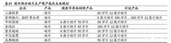 (1) 大硅片:日本信越等五大巨头占据全球 95%的大硅片市场份额,目前国内有上海新昇等少数企业实现 12 英寸大硅片量产。