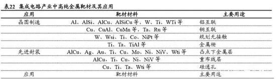 高纯溅射靶材(以下简称“靶材”或“溅射靶材”)主要应用于超大规模集成电路 芯片、液晶面板、薄膜太阳能电池制造的物理气相沉积(PVD)工艺,用于制备 电子薄膜材料,包括铝靶、钛靶、钽靶、钨钛靶等。芯片制造对靶材金属纯度的 要求最高,通常要达到 99.9995%以上。靶材市场最大的下游应用是包括半导体、 液晶面板等在内的电子行业。