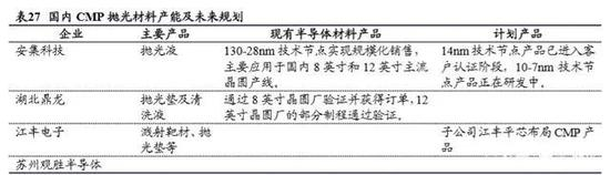 目前在 CMP 抛光材料行业实现突破的国内企业主要为安集科技、鼎龙股份、江 丰电子等。我国目前中低端 CMP 浆料已实现国产化,但半导体集成电路领域所 用的高端商品仍基本依赖进口,国内企业在该领域没有话语权。安集科技化学机 械抛光液已在 130-28nm 技术节点实现规模化销售,主要应用于国内 8 英寸和 12 英寸主流晶圆产线,14nm 技术节点产品已进入客户认证阶段,10-7nm 技术节点 产品正在研发中,公司前五名客户为中芯国际、台积电、长江存储、华润微电子、 华虹宏力。鼎龙股份实现了 CMP 抛光垫型号从成熟制程到先进制程完成全覆盖, 而且进入了长江存储供应链,大部分产品均在晶圆厂进行验证和测试。