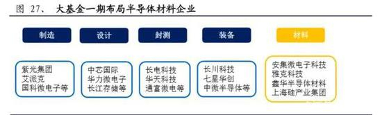 大基金一期已经在制造、设计、封测、材料等多领域布局。设计领域布局中芯国 际、华力微电子、长江存储等企业;半导体材料领域已布局安集微电子科技、雅克科技、鑫华半导体材料、上海硅产业集团等。