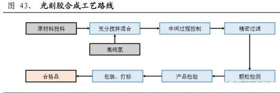 半导体光刻胶及配套材料具备产品技术更迭快、纯度高等特点。生产光刻胶需要 将感光材料、成膜树脂、光敏剂、添加剂、溶剂等组分有效地结合在一起。通常 在恒温恒湿 1000 级的黄光区洁净房、在氮气气体保护下将原料充分混合成均相液 体。随后经过多次过滤,并通过中间过程控制和检验,使其达到工艺技术和质量 要求,最后做产品检验,合格后在氮气气体保护下包装、打标、入库。