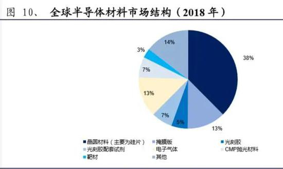 在半导体材料市场构成方面,晶圆材料(主要为硅片)、电子气体、光掩膜版、光 刻胶及其配套试剂占比前四,分别为 38%、13%、13%、12%;CMP 抛光材料、靶材市场份额分别为 7%、3%。