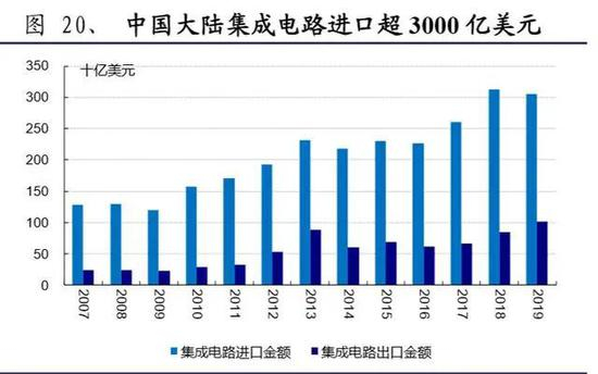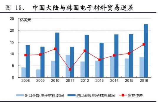 过去 10 年,中国大陆与日本、韩国、美国等国家或地区的电子材料贸易均为逆差。中国大陆与韩国、日本电子材料的贸易逆差常年维持在 10 亿美元上方,与美国电 子材料的贸易逆差逐年下滑,也仍有近 4 亿美元的规模。且自 2016 年来集成电路 产品成为我国单一最大宗进口商品,2018、2019 年进口金额分别为 3120、3055 亿美元,贸易逆差均超过 2000 亿美元,存在巨大的进口替代空间。