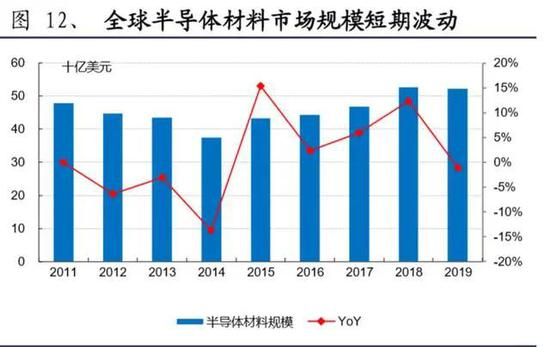 据 SEMI,中国大陆是全球半导体材料市场唯一实现同比增长的市场,2019 年半 导体材料行业规模同比增加 1.9%至 86.9 亿美元。全球其他地区的材料营收均持平 或呈个位数下跌。中国台湾因在晶圆代工、先进封装的优势,半导体材料消费规 模达 113.4 亿美元,连续第 10 年成为全球最大半导体材料市场。