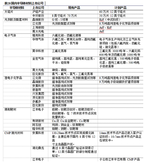 (4) 湿电子化学品:国产化程度领先,江化微、晶瑞股份等少数企业产品技术等级可达到 SEMI 标准G4、G5 级,客户覆盖中芯国际、华润微电子、长电科技等企业。新宙邦、兴发集团、巨化股份等企业也有布局。
