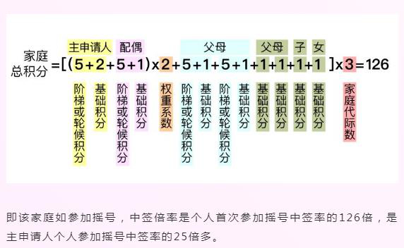 计算家庭总积分时,一是夫妻双方都在摇号的中签倍率高;二是家庭成员在摇号池中人多的中签倍率高;三是家庭有老有小、代际数多的,中签倍率高。