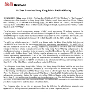 6月1日,网易公告,将在香港公开发行1.715亿股新普通股,发售价上限为126港元/股,代码为“9999.HK”。