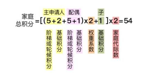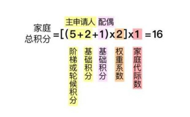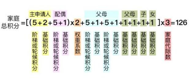 总积分=【(主申请人积分+配偶积分)×2+其他成员积分之和】×家庭代际数