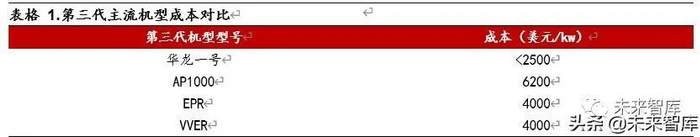 虽然第二代核电反应堆证明了核电在经济性上可以和其他能源相竞争,但是在经历了前苏联切尔诺贝利核电事故和美国三哩岛事故以后,各国对于核电的应用显得更加保守,而具有更高安全性的第三代反应堆则是提供了解决方案。三代堆面临的问题主要来源于成本方面,无论是在芬兰建设的 EPR 还是在美国本土建设的 AP1000,都先后由于超支等问题被延期或者叫停。目前国际上最主流的机型为俄罗斯的第三代 VVER,其占据了大部分国际市场。而我国的中核与中广核联合推出的华龙一号,拥有着更低的成本,可以保持在 2500 美元/kw 以内,远低于 AP1000 的 6200 美元/kw、EPR 和VVER 的 4000 美元/kw。