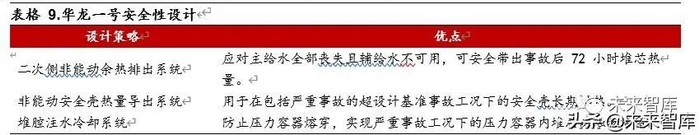 中核集团的华龙一号安全系统设计创新性地采用了能动加非能动的设计理念(中广核则采用三套非能动装置)。能动安全系统是高效、成熟、可靠的,且已经过充分工程验证的,而非能动安全系统可有效应对动力源丧失,以非能动安全系统作为能动安全系统的补充,可在保证技术成熟性的同时,通过多样化的手段大幅提高安全性。以能动和非能动的方式实现应急堆芯冷却、堆芯余热导出、安全壳热量排出和熔融物压力容器内滞留等功能,非能动系统作为能动系统的备用措施以多样化的形式确保电厂安全。
