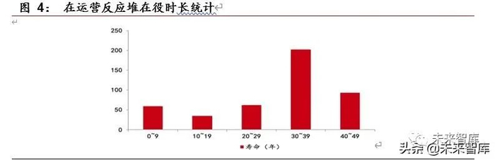 通过对 171 座永久关停反应堆的寿命进行统计,目前在运行的以第二代为主的核反应堆的平均寿命在 24 年左右(建造时预计使用时间为 30 年)。剔除掉因为政策或意外事故等原因退役的核电站,大多数反应堆的商业运行时间在 20-40 年之间,最长的为美国的 US-219,自 1969 年投入商业运行至 2018 年退役,总共运行了 49 年。而通过对目前在运行的反应堆的在役时长进行统计,可以看到高达 202 座反应堆的运行时间在 30-39 年之间,超过 40 年的更是达到了93 座,这些反应堆的更新换代势在必行。