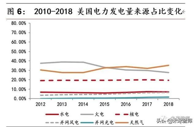 自 2010 年至 2018 年,中国火力发电占比从 71%降至 60%,同期美国电力净发电量中煤炭的占比从 37降至 27,但是在这段时间受到福岛核电站事故影响, 核能的占比却变化不大。在美国发电量占比增长明显的是天然气,虽然天然气是清洁能源,但是发电成本却相当高,接近煤炭的两倍,因此预计不会成为国际市场中,特别是在发展中国家中同核电形成竞争的主力。值得关注的是风能在美国能源结构中的占比从 3.48升至 6.53,从 140.82 亿千瓦时增至近翻倍的的 272.67 亿千瓦时,太阳能更是激增 15 倍。在未来,以风能、太阳能光伏为主的可再生能源将与核能形成激烈竞争。但是值得注意的是与核能对比,太 阳能和风能的劣势主要在于其发电量不稳定,并且输电困难,再加上更高的储 电成本以及对于环境的更高要求,其很难威胁到大规模发电需求下核电的地位。