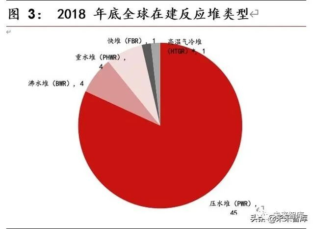 截止 2018 年底,全球共有 451 座核反应堆在运营,其中压水堆(PWR)占到了66%,轻水石墨堆(LWGR)则是俄罗斯独有的老旧机型(切尔诺贝利正是该堆型)。而目前在建的 55 座反应堆中 PWR 更是占到了 82%,其中值得注意的是唯一一座在建的高温气冷堆(HTGR)将是中国研发第四代核反应堆的试验机型。