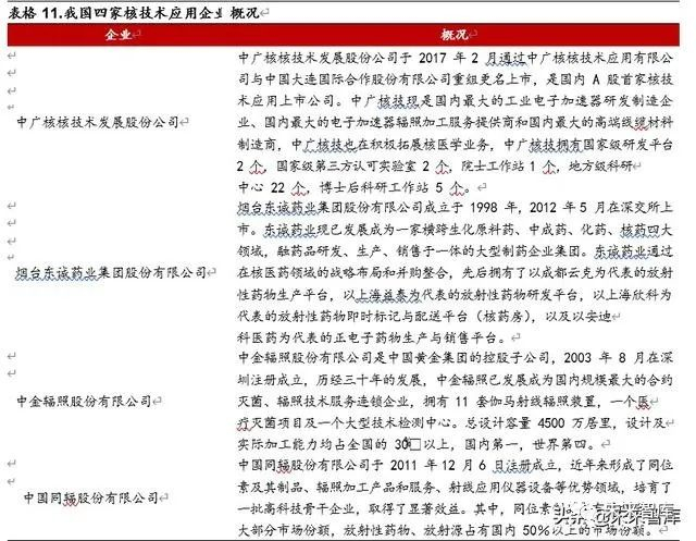 国内主要从事核技术应用产业的大企业有中广核核技术发展股份公司、烟台东诚药业集团股份有限公司、中金辐照股份有限公司和中国同辐股份有限公司四家。四家企业情况如下表所示。